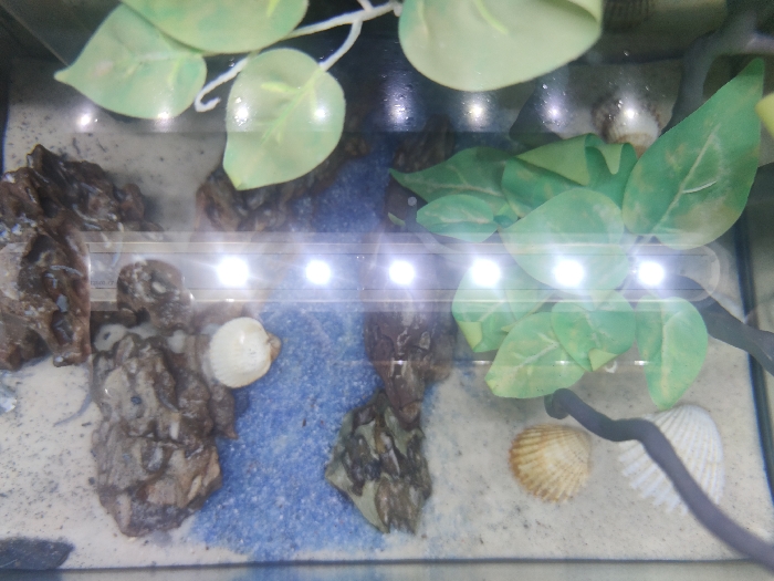 An overhead shot reveals an aquarium interior. The base layer features white sand punctuated by blue sand patches. Scattered across are decorative elements: dark, rough stones resembling driftwood and seashells of varying sizes. Artificial green leaves with light-colored stems and branches are also present, adding a touch of foliage to the scene. The lighting from the top of the aquarium is visible, reflecting off the water's surface and the aquarium's glass walls.