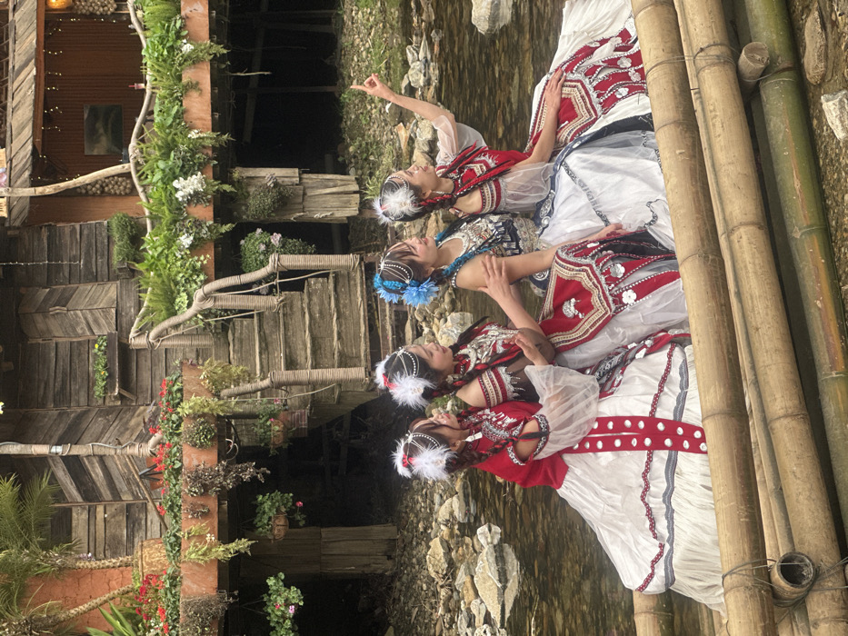 Four women are depicted seated on a bamboo raft in a calm body of water in Hoàng Liên, Vietnam. Each woman is dressed in elaborate traditional attire, featuring white, red, and dark garments with extensive silver embroidery and embellishments. Their heads are adorned with distinct headdresses, primarily featuring white feathers and silver chains, with one woman wearing a blue beaded headdress. The woman positioned furthest to the right points upwards with her right arm extended, while the second woman from the left has her left hand resting on the shoulder of the woman next to her. In the background, a multi-level rustic wooden building on a raised foundation is visible. This structure is constructed from dark wooden planks and features a prominent wooden staircase with a rope handrail. The building's balconies and ledges are heavily decorated with numerous potted plants and hanging baskets containing lush green foliage, red flowering plants, and white flowers. Reflections of the environment are visible on the water's surface, and rocks are scattered across the visible riverbed beneath the building.