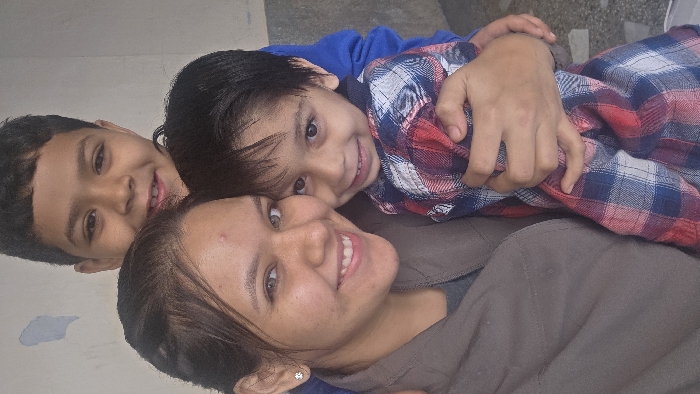 A woman and two young boys are in a close embrace, angled towards the camera. The woman is smiling broadly, with dark hair and fair skin. One boy, wearing a blue shirt and a red and blue plaid shirt, is nestled against her, also smiling. The other boy, with dark hair and skin, is next to her and appears to be smiling slightly. They are indoors, with a light-colored wall and floor visible in the background. The overall impression is a warm, loving family moment.