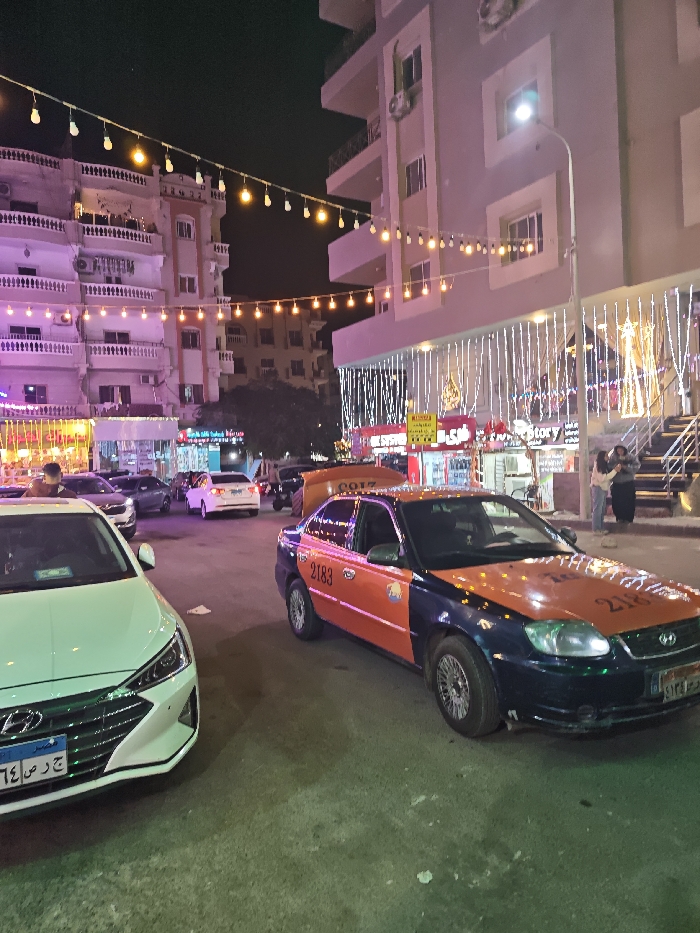 A street scene at night with a white Hyundai and an orange and black taxi in the foreground. Rows of string lights decorate the buildings in the background, with various shops visible. Other cars and people are present, contributing to a lively atmosphere. The focus is on the two cars in the front, showcasing their details amidst the busy street.