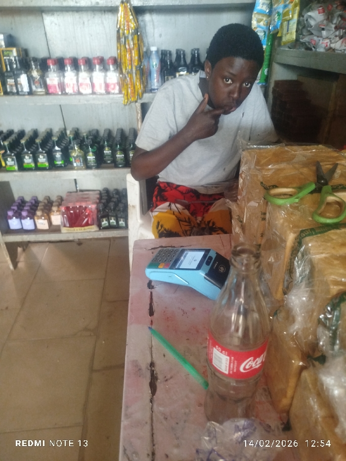 The scene depicts the interior of a small retail establishment in Unknown, Unknown. An individual with short dark hair, wearing a light grey t-shirt and patterned shorts, is seated behind a worn counter with a reddish, stained surface. The person looks directly at the camera, their right index finger positioned against their lips and thumb under their chin. On the counter, a light blue and black point-of-sale (POS) terminal with an illuminated screen is visible on the left. To its right lies a green pen, followed by an empty 50 cl glass Coca-Cola bottle. Further right, multiple stacks of clear plastic-wrapped packages, possibly containing food items, are present, with a pair of green-handled scissors resting on the top stack. In the background, three wooden shelves are fully stocked with various products. The top shelf displays numerous small clear-glass bottles and several bundles of yellow-wrapped items hanging vertically. The middle shelf holds rows of small, dark-colored bottles, many featuring green labels. The bottom shelf contains more small bottles, some with purple caps, alongside a rectangular red packaged item. The floor visible in the foreground is tiled. A "REDMI NOTE 13" watermark is in the bottom-left corner, and a timestamp "14/02/2026 12:54" is in the bottom-right.