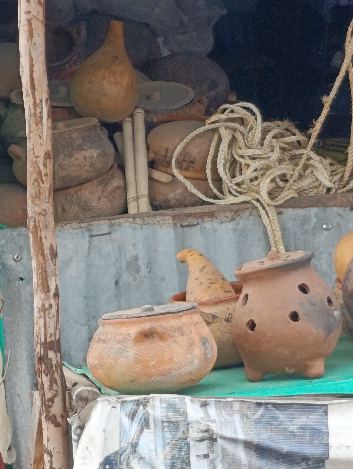 An array of rustic earthenware and gourds are stacked on a weathered shelf. Several clay pots sit on a green surface, one with a lid and another with ventilation holes. Above, larger pots and spherical gourds are clustered alongside rolled bamboo and coiled rope. The shelf is partially enclosed by a corrugated metal sheet. A rough-hewn wooden post supports the structure on the left.