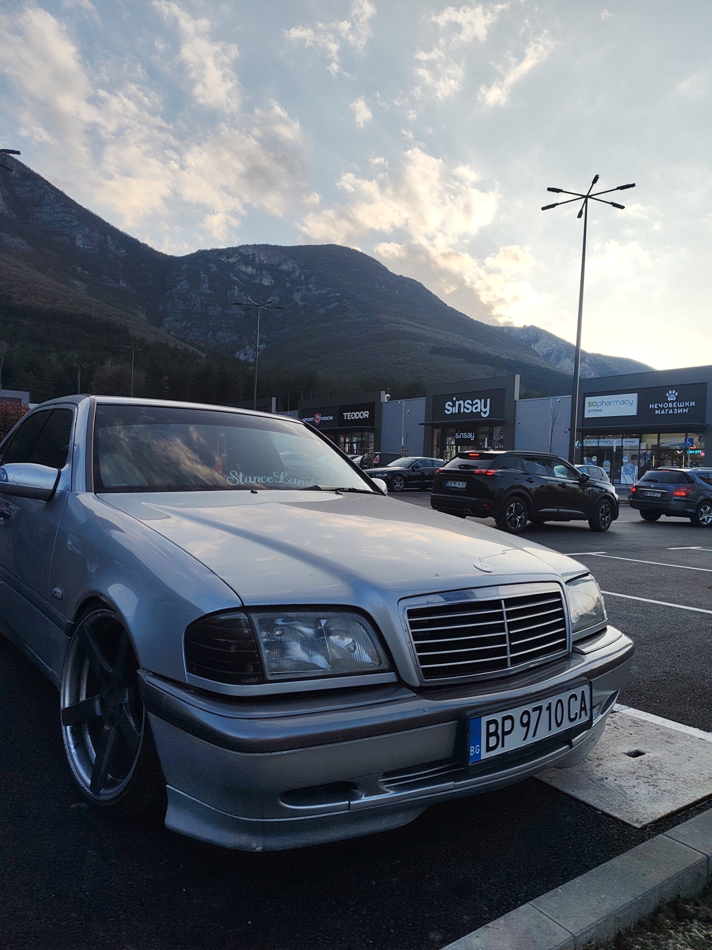 silver Mercedes-Benz car parked in front of a shopping center in Vratsa, Bulgaria, with mountains in the background. The car has a license plate that reads "BP 9710 CA". The shopping center has several stores, including "TEODOR," "sinsay," "sopharmacy аптека," and "НЕЧОВЕШКИ МАГАЗИН". Other cars are visible in the background. The sky is cloudy, and it appears to be dusk or dawn. A "Stance Land" sticker is on the car's windshield.