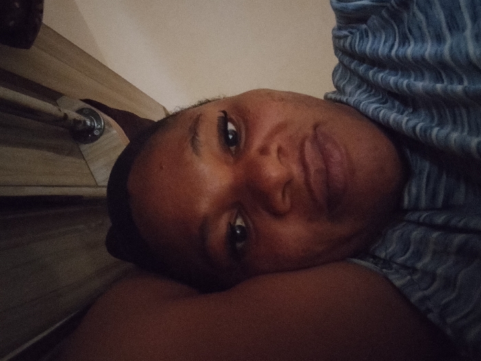 An individual is depicted in a close-up, rotated 90 degrees clockwise, in an indoor setting. The location is an unknown room within the city of Unknown, Unknown. The subject is a female with dark skin, dark eyes, and short dark hair, seen from the chest up. She is looking directly towards the camera with a neutral expression, her lips slightly parted. She wears a garment with blue and white horizontal stripes, visible on her right shoulder and chest area. Her head appears to be resting on a dark surface, possibly a pillow or arm, which occupies the lower left portion of the frame. In the background, to the subject's left, a light-colored wooden surface, potentially a piece of furniture like a headboard or dresser, is visible. A metallic rod with a circular base, possibly part of a lamp or fixture, is attached to this wooden surface. The lighting is dim, casting soft shadows. No other individuals are present.