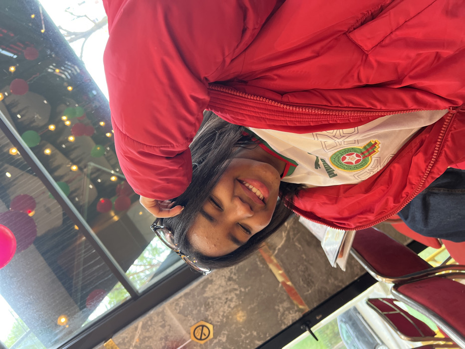 A young female with dark skin and long, dark hair is depicted in an indoor commercial setting, likely a cafe or restaurant in Salé, Morocco. She is observed from the chest up, smiling with closed eyes, wearing a bright red puffer jacket partially unzipped over a white short-sleeved t-shirt. The t-shirt bears the Royal Moroccan Football Federation emblem and a Puma logo. Clear-framed eyeglasses rest on top of her head in her hair, and her left hand is raised, touching her head. The background features a large window on the left, reflecting internal decorative elements including multiple red and green spherical ornaments and numerous small, warm-toned lights. Through the window, green foliage from trees and a portion of a dark-colored vehicle are visible outdoors. Adjacent to the window, a dark, textured column displays a yellow hexagonal sign with a black symbol. Red chairs with metallic frames are partially visible on the left side of the scene. In the lower foreground, partially obscured, are papers or a menu on a surface.