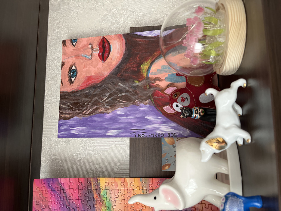 This image, taken in Lobnya, Russia, displays a collection of decorative objects arranged on a dark brown shelf against a textured light-colored wallpaper. From left to right, the scene includes: a vertical jigsaw puzzle or print featuring a gradient of colors from pink to orange; a white ceramic elephant figurine with pink ears, its trunk raised, facing left; a small, partially obscured blue figurine; and a small postcard-sized print with autumnal foliage patterns. Central to the display is a vertical painting or print depicting the partial face and upper torso of a woman with wavy brown hair, blue eyes, and red lips, rendered in a stylized manner against a purple background with white brushstrokes. Cyrillic text, "ВСЕ СБУДЕТСЯ!" (Everything will come true!), is visible along the left edge of the painting. In the foreground, below the painting, are a white ceramic dog figurine with gold accents on its ears and tail, facing right; a smaller black figurine, possibly a cat, with colorful markings; and a reddish-brown plush or felt animal figure resembling a cartoon dog. To the far right, a clear glass dome containing multiple pink artificial tulips with green stems rests on a light wooden base. No people are present, and no actions or interactions are depicted; the scene is a static arrangement of decorative items.