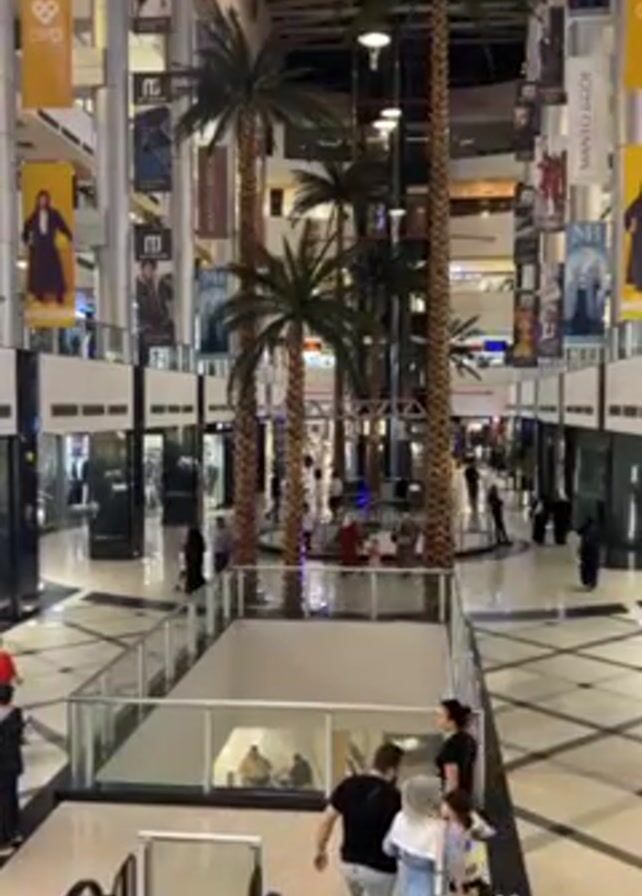 n indoor shopping mall with a multi-level structure and several tall artificial palm trees arranged in the central open space. Banners and advertisements hang from the upper levels. People are walking around, some are using the escalator to go down. The floor has a dark and light geometric pattern. There are glass railings surrounding the open areas.