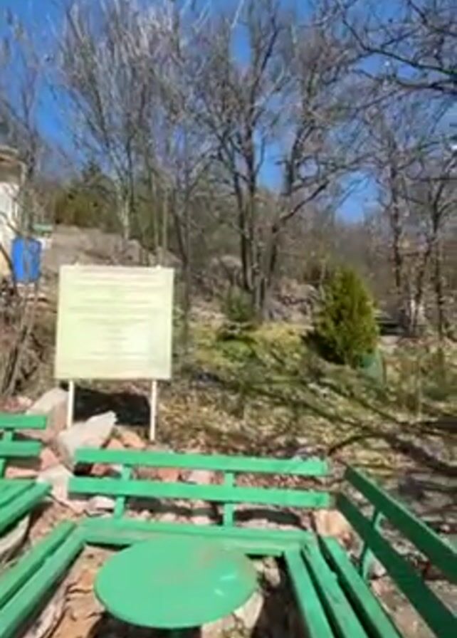 n outdoor resting area with green benches and tables on a stone platform. A sign stands behind the benches. Beyond the resting area, there's a pathway leading into a wooded area. As the camera pans up, two women are visible standing near the benches. The video ends with a view of a sunny landscape, with trees and mountains in the distance. The overall setting suggests a natural, possibly mountainous environment.