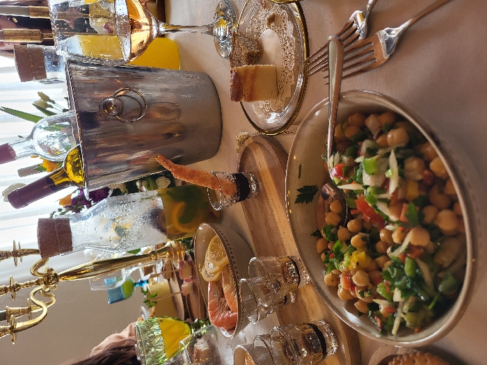 The image displays a dining table set indoors in Favões, Portugal, against a backdrop of white curtains. A white tablecloth covers the table, laden with various food and beverage items. A silver ice bucket, containing two bottles (one with a gold label, another clear), stands prominently. Adjacent to it, a clear glass carafe with a cork stopper holds a lemon and mint-infused drink. To the left, a tall, ornate gold candelabra is partially visible. In the foreground, a ceramic bowl containing a chickpea salad with chopped peppers, onions, and greens holds a silver spoon. Another bowl to its left contains peeled shrimp and lemon slices. A shot glass contains a fried shrimp tempura in a dark liquid. On the right, a stemmed glass holds a golden beverage, and a decorative glass plate features a slice of cake and a smaller pastry. Multiple silver forks are arranged on the tablecloth to the right of the chickpea salad. Other objects include a green textured glass with orange liquid, appetizers on skewers on a wooden board, and multiple shot glasses on a wooden tray. A person's arm in a light brown sleeve is visible on the far left, and the upper head of another individual is seen in the upper right.