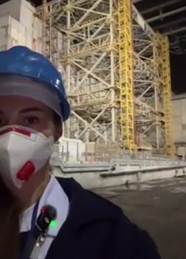 A woman wearing a blue hard hat and a white face mask stands in front of a large, complex metal structure. The structure is predominantly yellow and white, appearing as a multi-layered framework of beams and supports. She wears a dark blue coat with a white collared shirt underneath. A small microphone is clipped to her shirt. The ground is wet, reflecting some light, and the background is dark. The scene has an industrial feel, possibly a construction or engineering site.