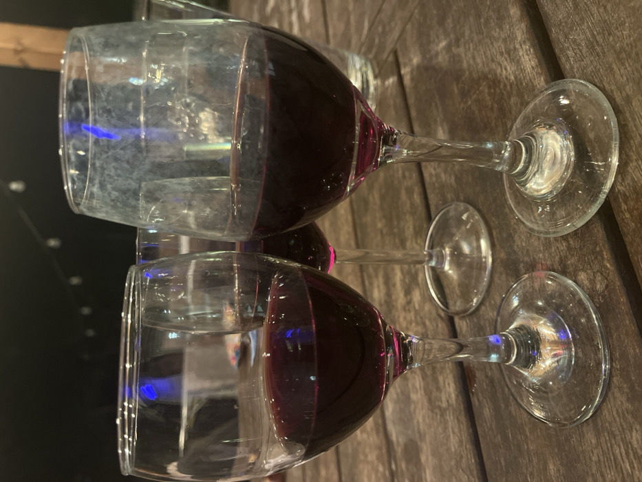- "Three stemmed wine glasses, each containing dark red wine, are arranged on a dark-stained wooden slatted table" by FM-CKvQF3, licensed under CC BY 4.0