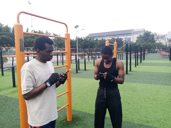 This image depicts an outdoor calisthenics park in Jiangjin, China. The ground is covered in green artificial turf, patterned with lighter green stripes. Numerous orange and black metal exercise structures, including pull-up bars, parallel bars, and a ladder-like apparatus, are systematically arranged throughout the area. In the background, trees, light poles, and a large multi-story building with a dark roof and numerous windows are visible under an overcast sky. Two males are present in the foreground. The individual on the left, wearing a light beige short-sleeved t-shirt and dark trousers with a red stripe, stands near an orange ladder structure. He is wearing black fingerless gloves and is actively viewing a smartphone held in both hands, with a neutral expression. The individual on the right, dressed in a black tank top and black sweatpants with a white drawstring, also wears black fingerless gloves and is similarly engaged with a smartphone held in both hands, displaying a slight smile. Both subjects are independently focused on their mobile devices within the exercise setting.