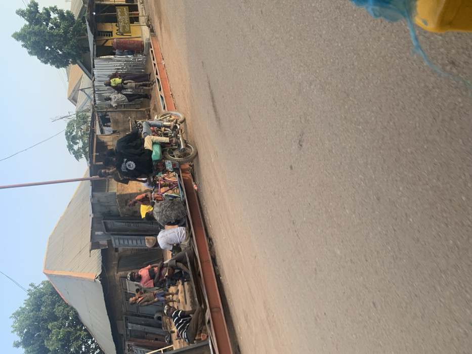 A roadside scene features a row of people gathered along a corrugated metal-roofed building with a rusty iron beam bordering the structure. A motorcycle and bicycles are parked near the crowd. The street pavement extends into the frame. The image is captured from a slightly elevated perspective with a hint of sky and trees visible above the building. A partial view of a blue object is on the upper right side of the image.