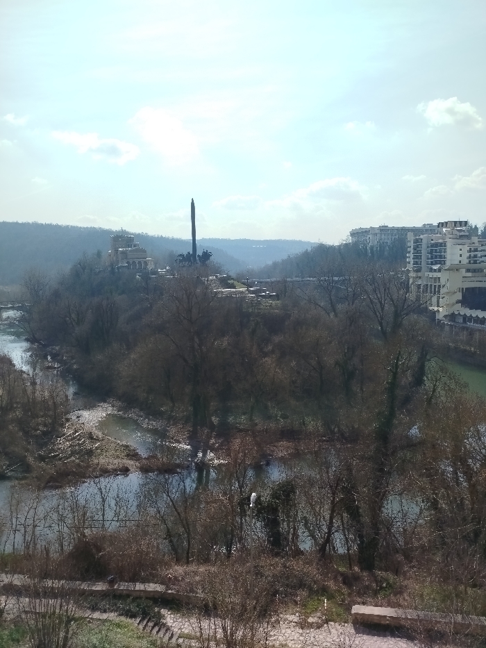 An elevated panoramic view captures a wide segment of the Yantra River as it forms a prominent horseshoe bend in Veliko Tarnovo, Bulgaria. The sky above is light blue with scattered white, wispy clouds, suggesting a bright day. Central to the scene, situated on a wooded hill within the river's bend, stands the Asen's Monument (Monument of the Assen Dynasty). It features a tall, slender, dark obelisk flanked by four large equestrian statues. To the immediate left of the monument is the multi-tiered, light-colored Art Gallery "Boris Denev," characterized by its arched windows and intricate architecture. The Yantra River flows through the valley, exhibiting calm water with varying shades of blue, green, and brown, reflecting the sky in places. Exposed gravel and sandbanks are visible along its edges and in shallower sections within the bend. A bridge structure is faintly visible spanning the river in the far distance to the left, beyond the monument hill. The surrounding landscape consists of densely forested hillsides covered predominantly with deciduous trees, which are bare of leaves, indicating late winter or early spring. Scattered patches of dry, brown undergrowth and some evergreen ivy on trees are also present. On a higher ridge across the river to the right, a cluster of modern, multi-story white buildings with numerous balconies is visible, overlooking the valley. In the immediate foreground, the edge of a paved surface or pathway is discernible, alongside sparse, dry vegetation. A white street light pole stands in the lower right section of the frame. No individuals are visible in the depicted scene.