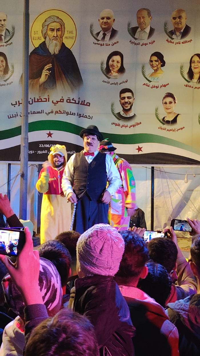 A banner displays portraits of individuals with Arabic text beneath each, including names like Elias the Prophet, Maan Hanna Kousa, and Nadine Atieh. Below the banner, a stage features performers. One is dressed as Charlie Chaplin, complete with a bowler hat and cane, another as Winnie the Pooh, and a third as a clown. A crowd has gathered, with many people holding up phones to record the performance. The event appears to be a public gathering or street performance, possibly for entertainment purposes.
