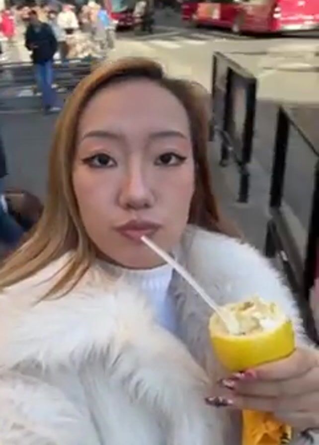 A young woman stands on a city street, holding a lemon filled with shaved ice and a straw. She is wearing a white fuzzy jacket over a white turtleneck shirt. Her hair is long, light brown and straight. She has light-colored eyeshadow and defined eyebrows. The background shows busy city streets with buildings, cars, scooters, pedestrians, and a bus. She takes a sip from the lemon, looks around, and then smiles at the camera, sticking her tongue out briefly.