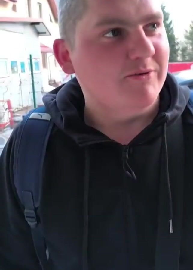 A young man with light skin and short hair is walking towards the camera. He is wearing a black hooded jacket and a backpack. As he walks, he turns his head to the side. The camera pans to the right, showing a dark-colored Ford Edge parked next to a dark blue Audi Q5. The vehicles are parked on a paved surface, and buildings are visible in the background. The man says something unintelligible at the beginning of the video.