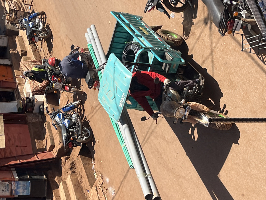 The image displays a sunlit, unpaved reddish-brown street scene in Labé, Guinea, bustling with vehicles and pedestrian activity. In the foreground, a green three-wheeled motor-tricycle is driven by a person wearing a red long-sleeved shirt and dark pants. The driver's head is obscured by a turquoise sunshade attached to the cargo bed, which displays "SAHARA ORIGINAL" text. The tricycle is laden with several long grey and green pipes strapped horizontally across the top of the cargo bed, extending beyond the front wheel. Coils of black material are visible within the cargo bed. Distinct shadows are cast on the street from objects and structures, indicating bright daylight. In the middle ground, several motorbikes are present. One man, wearing a blue shirt and a red helmet, sits on a red motorbike, facing away from the viewer. Adjacent to him, another man, dressed in a dark top, a reflective yellow-green vest, and a dark face covering, stands beside a red motorbike while holding a phone to his ear. A blue motorbike is parked further to the left. The background reveals buildings with reddish-brown walls and dark door/window frames, accessed by steps constructed from packed earth or brick leading up from the street level.
