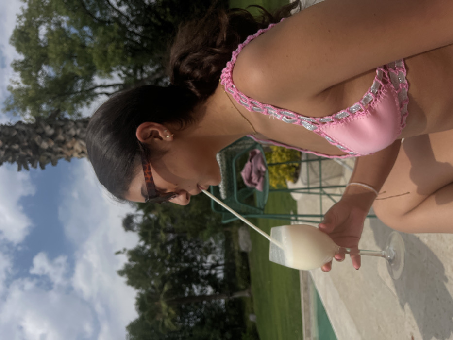 The scene is set outdoors in Santa Ana Yancuitlalpan (Chilhuacán), Mexico, under a partly cloudy sky with bright sunlight. A young woman, viewed in profile from the waist up, is seated on a light-colored concrete patio adjacent to a light blue swimming pool. She has dark hair styled in a ponytail, wears tortoiseshell sunglasses, and small gold stud earrings. She is dressed in a pink bikini top with silver-colored crocheted trim and a thin gold necklace. The woman holds a stemmed glass in her left hand, which contains an opaque white beverage. A long, white straw extends from the glass to her mouth, and she is actively drinking. A thin white bracelet is visible on her left wrist. In the middle ground, behind and to the right of the subject, a dark green metal outdoor chair or stool is present, draped with a piece of purple fabric. Beyond the patio area, a manicured green lawn is visible, bordered by a dense line of trees, including several tall palm trees and other green deciduous foliage.