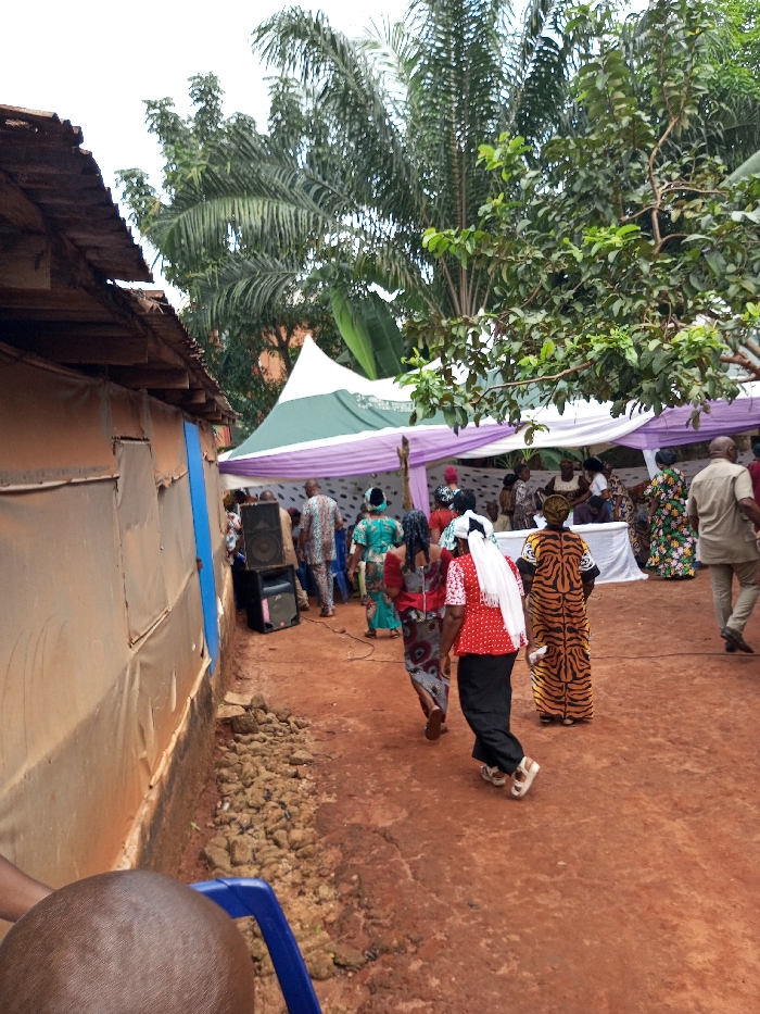 The image captures an outdoor gathering in Oko Town, Nigeria, characterized by a prominent red earth ground surface. To the left, a building with a corrugated metal roof and light-colored, possibly fabric-covered, walls is visible, featuring a vertical blue section. Adjacent to this wall, two black audio speakers are stacked, with associated wiring on the ground. A line of loose rocks and soil runs along the base of the building. In the mid-ground, a white and green tent with purple decorative fabric is erected, sheltering a group of individuals. Numerous people, predominantly adults, are dressed in vibrant, patterned traditional attire, with several individuals seen walking towards or congregating under the tent; a white table is also visible within the tent area. Specific individuals include a woman wearing a red patterned top, black trousers, white sandals, and a white headscarf; another woman in a patterned dress; and a third woman in a long, tiger-striped dress. The background features lush tropical vegetation, including tall palm trees and various green leafy trees. The upper portion of a human head and part of a blue plastic chair are visible in the bottom-left foreground.