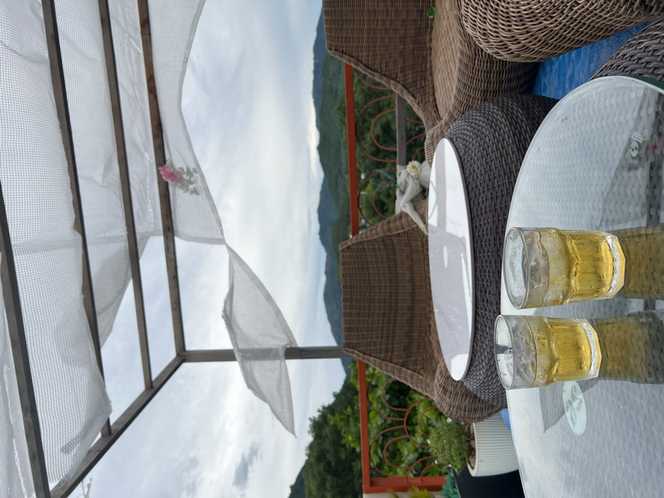 - "The image displays an elevated outdoor seating area, likely a rooftop terrace or balcony, set against a backdrop of distant green mountains under an overcast sky in Nha Trang, Vietnam" by FM-U93nI3, licensed under CC BY 4.0