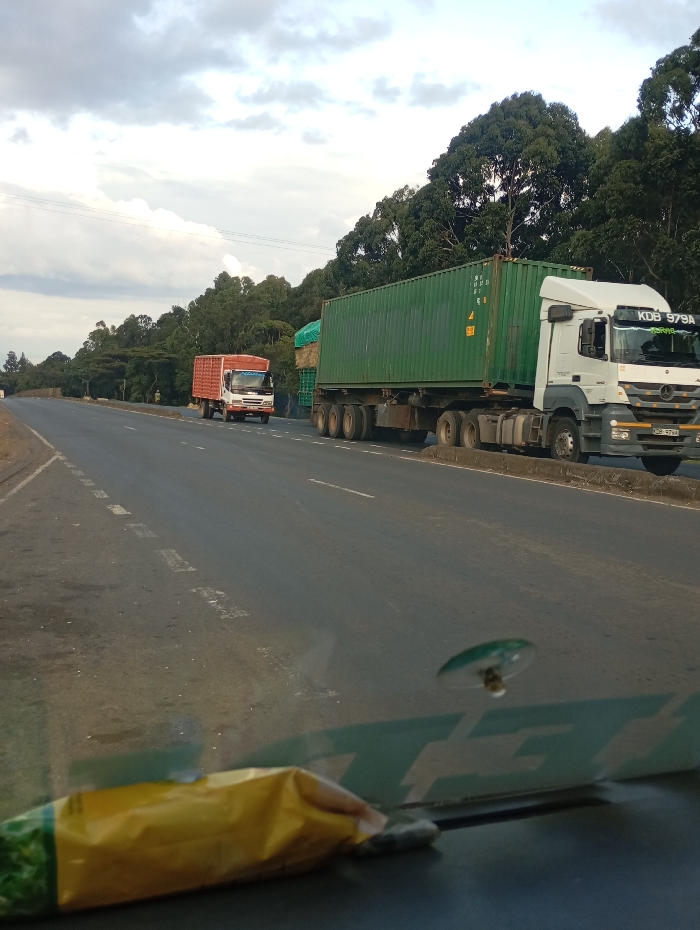 The image displays a multi-lane asphalt highway in Molo ward, Kenya, under a partly cloudy sky. On the right side of the road, a white Mercedes-Benz Actros semi-trailer truck, license plate KDB 979A, is prominent, hauling a large green shipping container. Further down the road in the left lane, an orange box truck proceeds in the same direction, with another truck, partially obscured, carrying a green tarp-covered load behind it. The highway features white dashed lane markings and a concrete median barrier separating the lanes. Dense green trees and foliage line both sides of the road. The perspective is from inside a vehicle, with a yellow-packaged item resting on the dashboard in the immediate foreground, along with a small round object affixed to the windshield and a partial reflection of interior text.