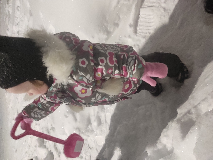 - "A young child, wearing a black knit hat, a floral-patterned winter coat with a fur-trimmed hood, and pink mittens, plays in the snow" by FM-Kwum52, licensed under CC BY 4.0