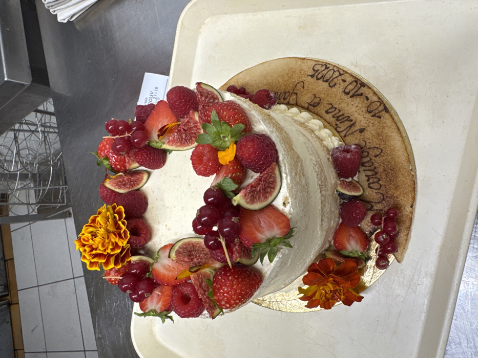 - "The image displays a two-tier "naked" wedding cake, richly decorated with fresh fruits and flowers, situated on a beige plastic serving tray within a professional kitchen environment in Hoenheim, France" by FM-tqhxs2, licensed under CC BY 4.0