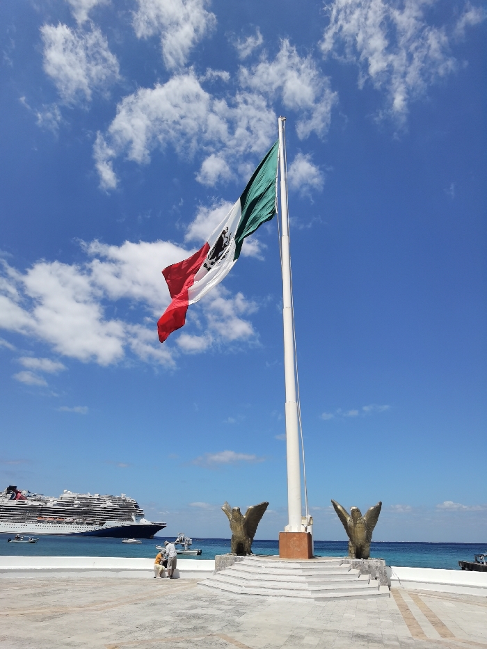 Mexican flag flying high on a flagpole in front of the Cozumel Cruise Terminal, located in Cozumel, Mexico (latitude: 20.511, longitude: -86.951). The flag is waving gently in the breeze against a bright blue sky with white clouds. Two bronze sculptures of eagles are positioned on either side of the flagpole, and there are two people standing near the sculptures. A large cruise ship is visible in the background, docked at the terminal. The scene is a bright, sunny day with clear, blue water in the background.