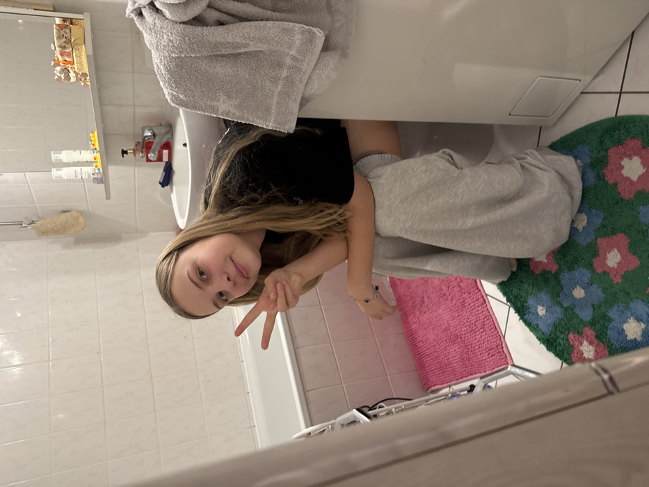 A young female, with light brown hair and wearing a black short-sleeved top and grey sweatpants pulled to her knees, is seated on a white toilet within a residential bathroom in Blankenfelde, Germany. She faces the camera, displaying a peace sign with her right hand and a subtle smile. Her left wrist bears a dark-beaded bracelet. The bathroom features white tiled walls and floor. A white bathtub is partially visible to the left, adjacent to a pink rectangular bath mat. A white shower curtain rail extends vertically on the left edge of the frame. Behind the subject, a white sink with a chrome faucet is mounted, above which a silver shelf holds two white bottles, several small yellow rubber ducks, a red pump dispenser, and four stacked, wrapped items. A light brown loofah hangs on the wall. To the right of the toilet, a white appliance, possibly a washing machine, stands with a grey towel draped over its top. A green bath mat with pink and blue floral patterns is positioned on the floor in front of the toilet.