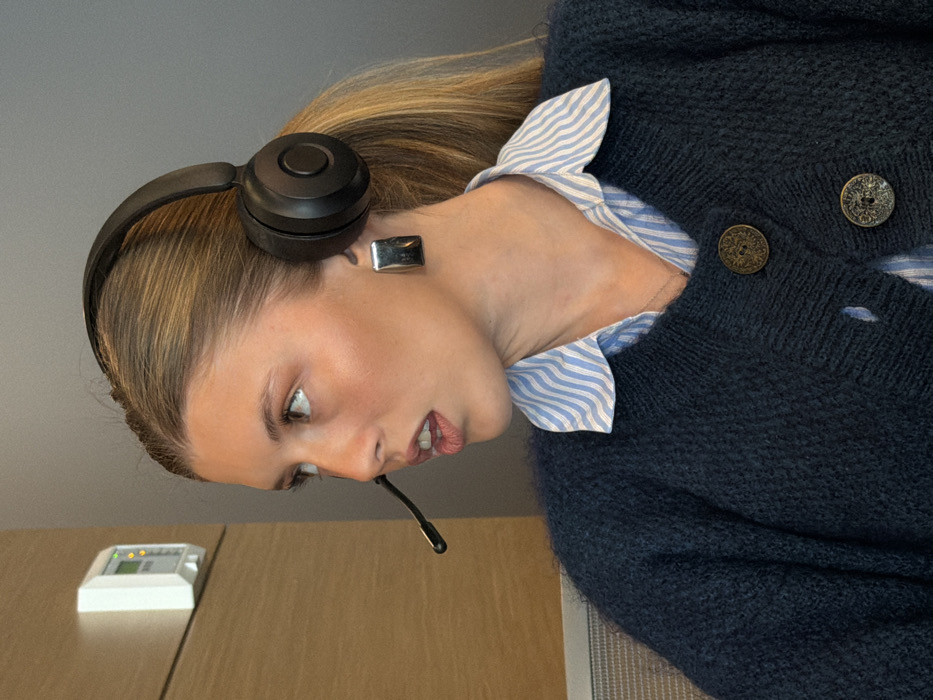 A woman with blonde hair wearing a black headset and silver earrings looks intently to the left. She wears a blue striped shirt under a dark blue knit cardigan with ornate buttons. A small white device with lights rests on a wooden surface to her left. The background is a neutral gray.