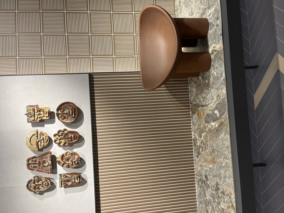 This image depicts an interior display space in Bologna, Italy. The scene features a multi-paneled wall, a display surface, a chair, and a patterned floor. The left section of the rear wall consists of two distinct panels. The upper panel is a smooth, light gray surface, upon which eight stylized masks are mounted in two rows of four. These masks, varying in shape (oval, rectangular, triangular, circular), appear to be crafted from a reddish-brown, possibly ceramic or terracotta, material with painted details in beige and darker reddish-brown. They exhibit carved features representing faces with distinct eyes, noses, and mouths. Below this, the lower left wall panel features a vertically ribbed texture, composed of narrow, light brown slats with thin white vertical lines. The right section of the rear wall displays a patterned wallpaper or panel. It features a grid of squares, each filled with parallel thin, light-colored lines against a light brown background. The orientation of these lines alternates between vertical and horizontal in adjacent squares, creating a checkerboard effect. A long, horizontal display surface, resembling a console or low counter, spans the lower mid-ground of the image. Its top surface is made of mottled gray and brown marble or stone, resting on a dark gray or black base. On the right side of this display surface, a distinctive, low chair or stool is positioned. It is a solid, dark reddish-brown color with a smooth, concave, bowl-shaped seat supported by three thick, cylindrical legs. The floor exhibits a dark gray herringbone pattern, diagonally crossed by a lighter brown or beige herringbone stripe. No people, actions, or interactions are present in the scene. The image solely presents a static arrangement of interior design elements and decorative objects.