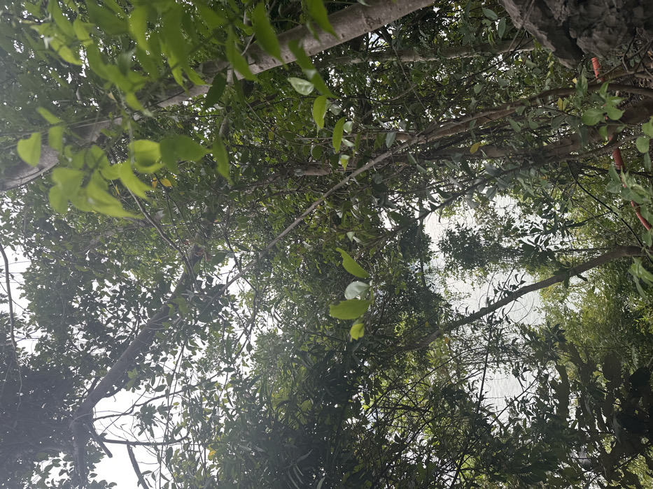 Looking directly up into a dense canopy of trees, sunlight barely filters through