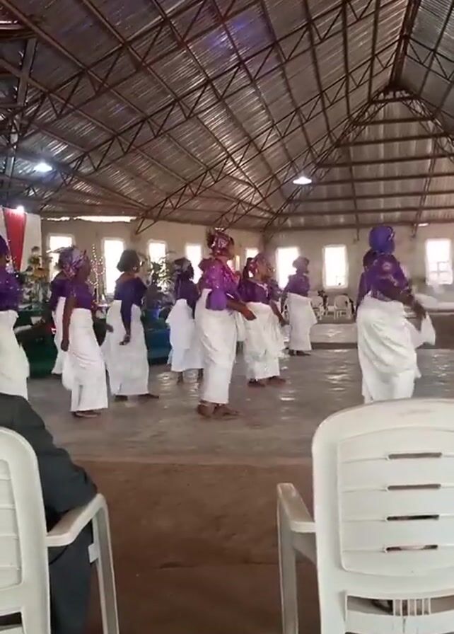 A group of women in matching purple and white outfits are performing a dance in a large hall. The hall has a high ceiling with exposed metal beams and several windows providing natural light. The women are barefoot and move in unison, with some arm movements. A man is seated in the foreground, watching the performance. There are several white plastic chairs in the foreground.