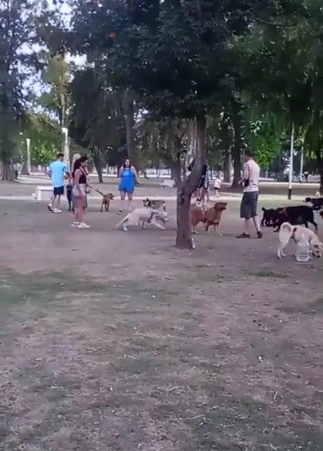 The video captures a lively scene in what appears to be a public park. Several people are present, and a significant number of dogs of varying breeds and sizes are interacting with them and each other. Some individuals are standing and conversing, while others seem to be supervising the dogs. The park has trees providing shade, and there's a grassy area where the dogs are roaming freely. A few benches and light poles can be spotted in the background. The overall atmosphere suggests a communal gathering centered around dog ownership and socializing in the park setting.