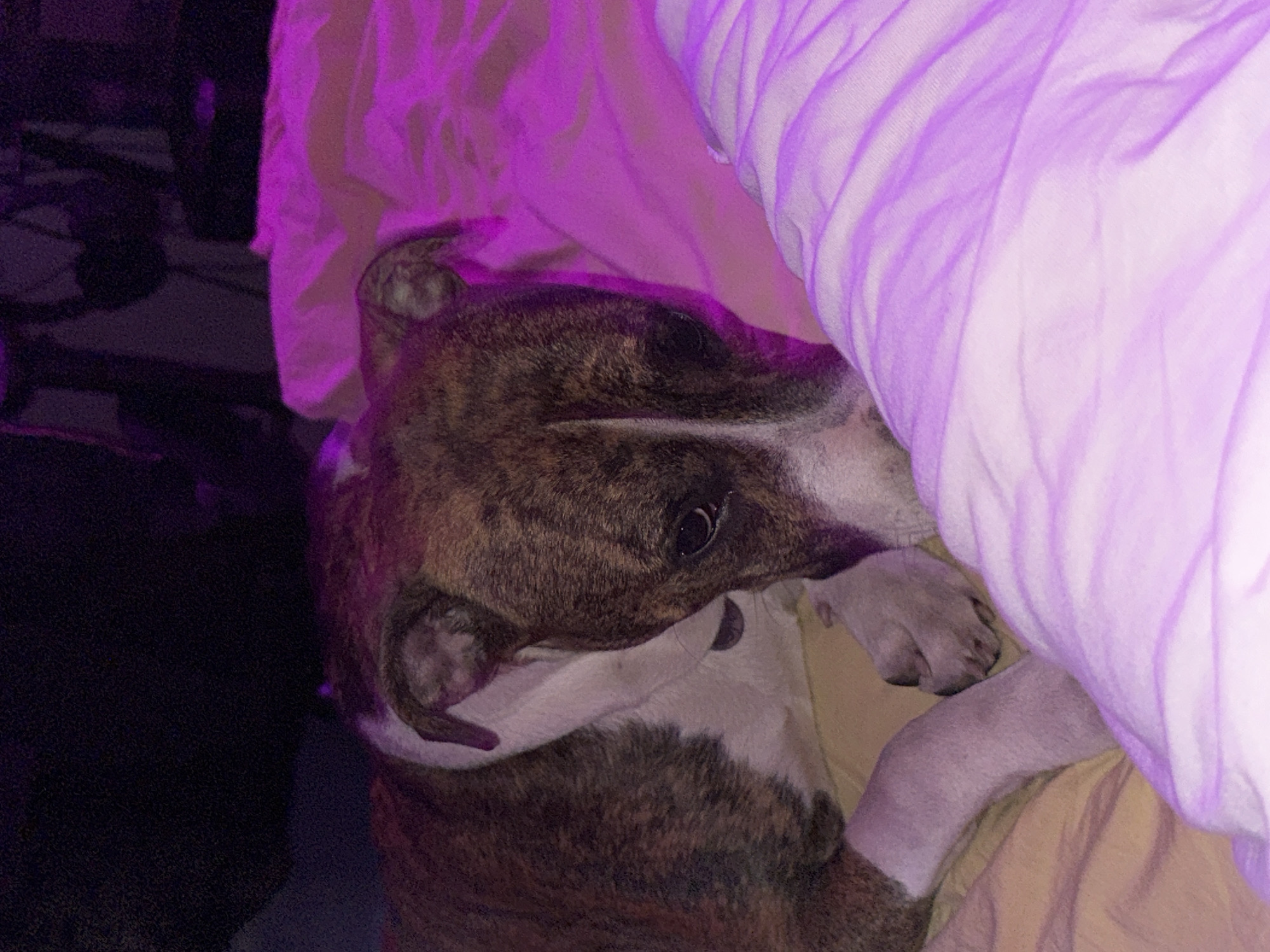 - "A brindle-colored dog is curled up under white/lavender-colored bedclothes on a yellow sheet" by FM-2t2Dl2, licensed under CC BY 4.0