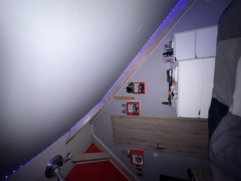 The image depicts the interior of an attic room, likely a bedroom, located in Gerstheim, France. The perspective is from a low vantage point, presumably from a bed with gray and dark green bedding visible in the foreground. The room features a steeply sloped white ceiling with an exposed light-colored wooden beam running diagonally, adorned with a string of blue LED lights. A metallic ceiling light fixture with two bulbs is mounted on the upper left section of the ceiling. The walls are painted a light gray, with a distinct section on the far left painted red. A light-colored wooden door with a metallic handle is centrally positioned on the left wall. To the right of the door, three red square shelves are mounted on the gray wall; each contains small collectible figurines. An additional red shelf to the left of the door holds a framed item and other small objects. A decorative hanging item is suspended from the wooden beam near the red shelves. Below the red shelves, a white dresser with multiple drawers is positioned against the wall. Its surface holds various items, including bottles, a white gaming controller (resembling a PlayStation controller), an instant camera, and other miscellaneous objects. To the immediate right of the dresser, a white two-drawer cabinet or chest is present. No individuals, actions, or direct interactions are visible within the scene. The room is illuminated by the blue LED strip lights, casting a dim, cool ambient light.
