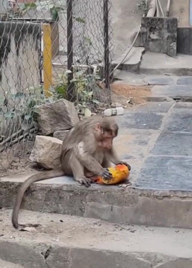 - "A monkey sits on a grey concrete step in an urban setting, holding a yellow and orange object in its hands, possibly food" by FM-Qmj6l1, licensed under CC BY 4.0