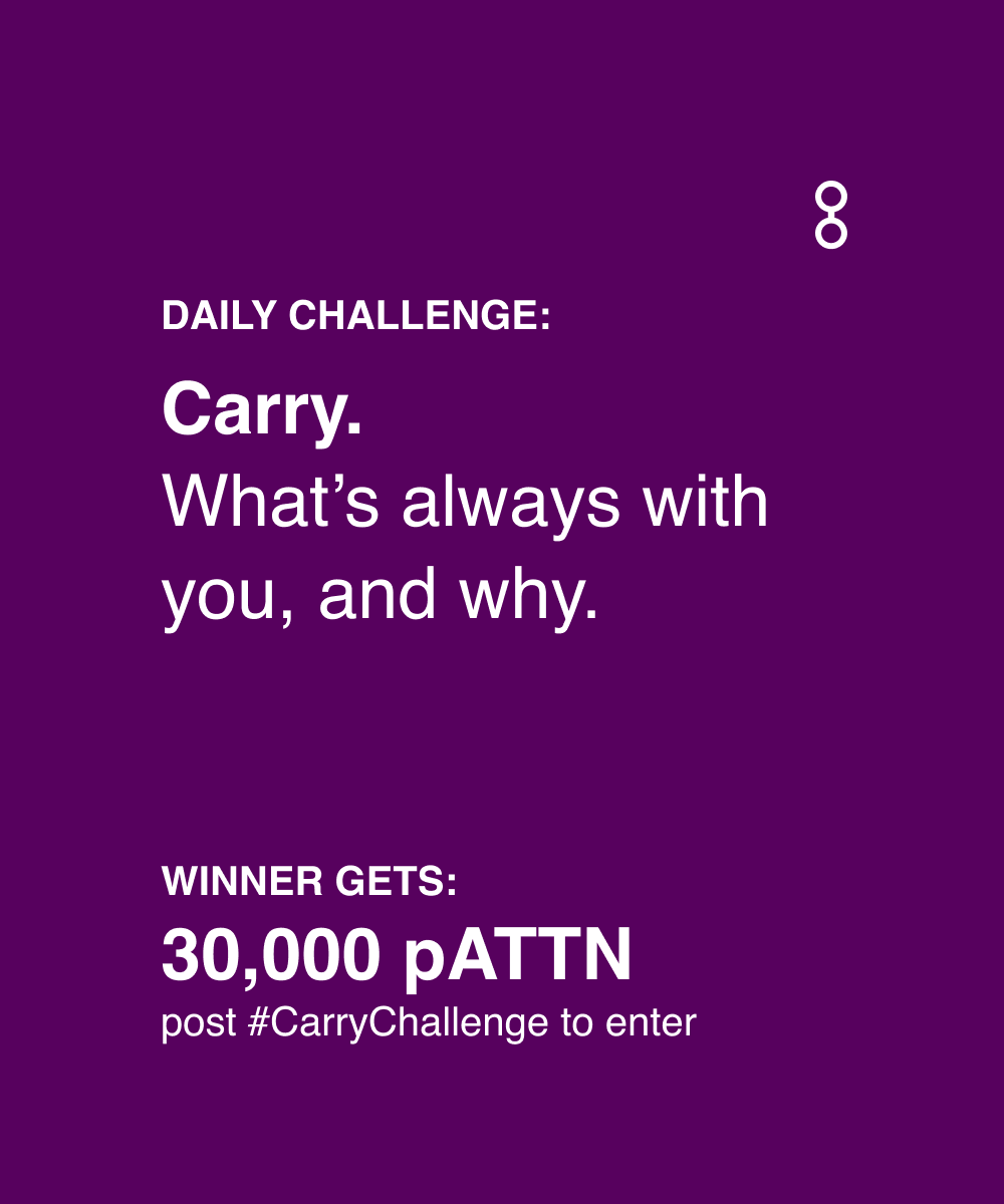 The image promotes a daily challenge themed around the concept of "Carry." Participants are prompted to reflect on what they always carry with them and explain why. The grand prize is 30,000 pATTN. Participants can enter by posting their response with the hashtag #CarryChallenge. The number eight is prominently displayed in the upper right-hand corner, possibly indicating the day of the challenge. The background color is a deep purple.