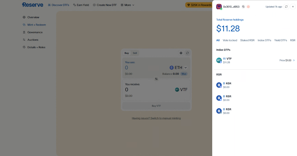 The image is a screenshot of the Reserve.app web interface. The user interface is a digital representation of a platform for trading and managing digital assets. The background color of the interface is a pale brown. The interface is divided into two sections: the left side and the right side. The left side contains a vertical menu with the following options: Overview, Mint + Redeem, Governance, Auctions, and Details + Roles. The right side contains a digital asset exchange with a variety of functions. The top section of the right side contains the user's total Reserve holdings, which are currently $11.28. Below this, a list of the user's asset holdings is displayed. The user has 11 VTF digital assets with a total value of $11.28, and 0 RSR digital assets. The user has the option to buy VTF with ETH. The user's ETH balance is 0.00. The image is likely from a computer screen, and appears to have been taken in a home or office setting. The location of the image is irrelevant to the content of the screenshot.