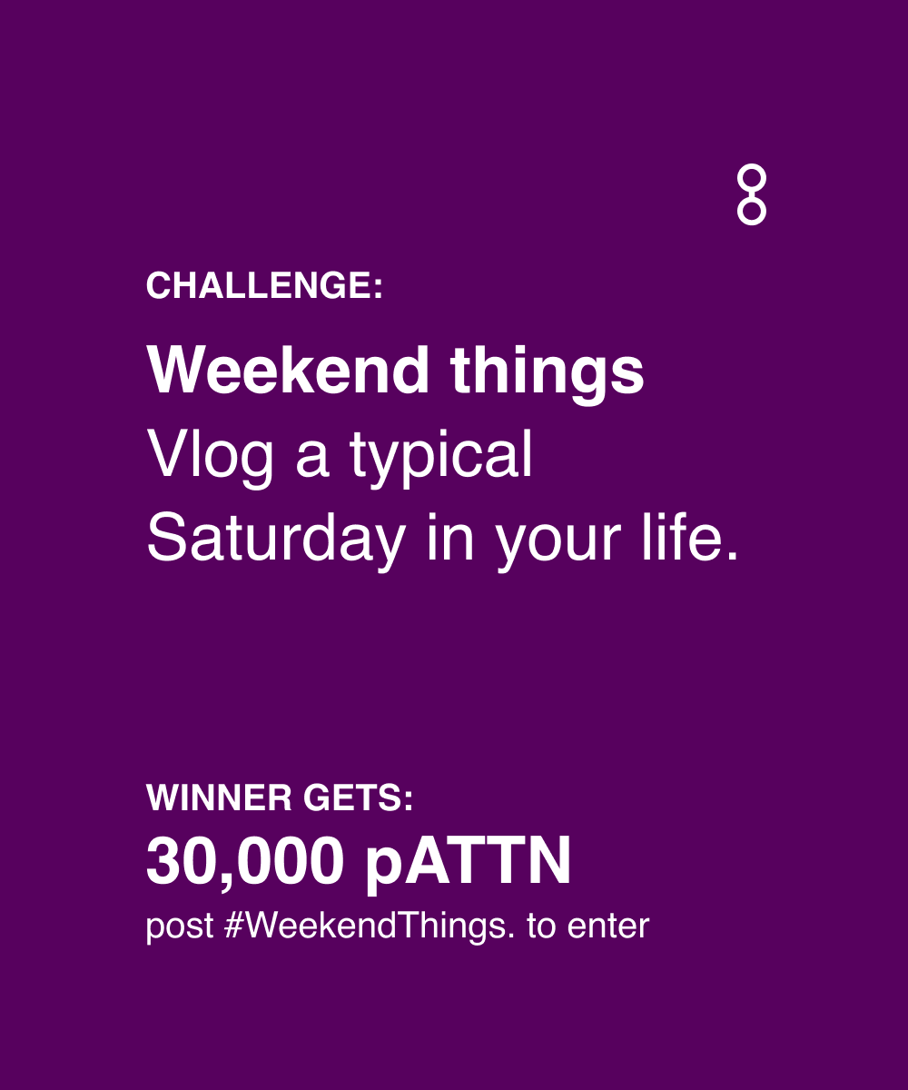 A promotional image in a dark purple color features a challenge. The challenge is to vlog a typical Saturday. The winning prize is 30,000 pATTN. To enter, participants need to post using the hashtag #WeekendThings. The number 8 is displayed in the top right corner.