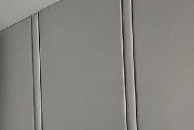 wall with three vertical panels. Each panel is separated by a narrow, vertical strip, creating a grid-like pattern. The panels are all a light grey color. The wall is located in a building in Ho Chi Minh City, Vietnam, at coordinates 10.771066047855625, 106.70045824206437. The image is taken at an angle, looking towards the left side of the wall. There are no people or objects in the image.