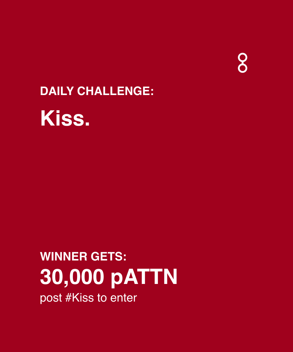 The image is a red square graphic promoting a daily challenge. The text "DAILY CHALLENGE:" is followed by "Kiss." The contest winner receives "30,000 pATTN". Instructions state to post using "#Kiss" to enter. A stylized white number "8" is in the upper right corner. The background is a uniform dark red color.