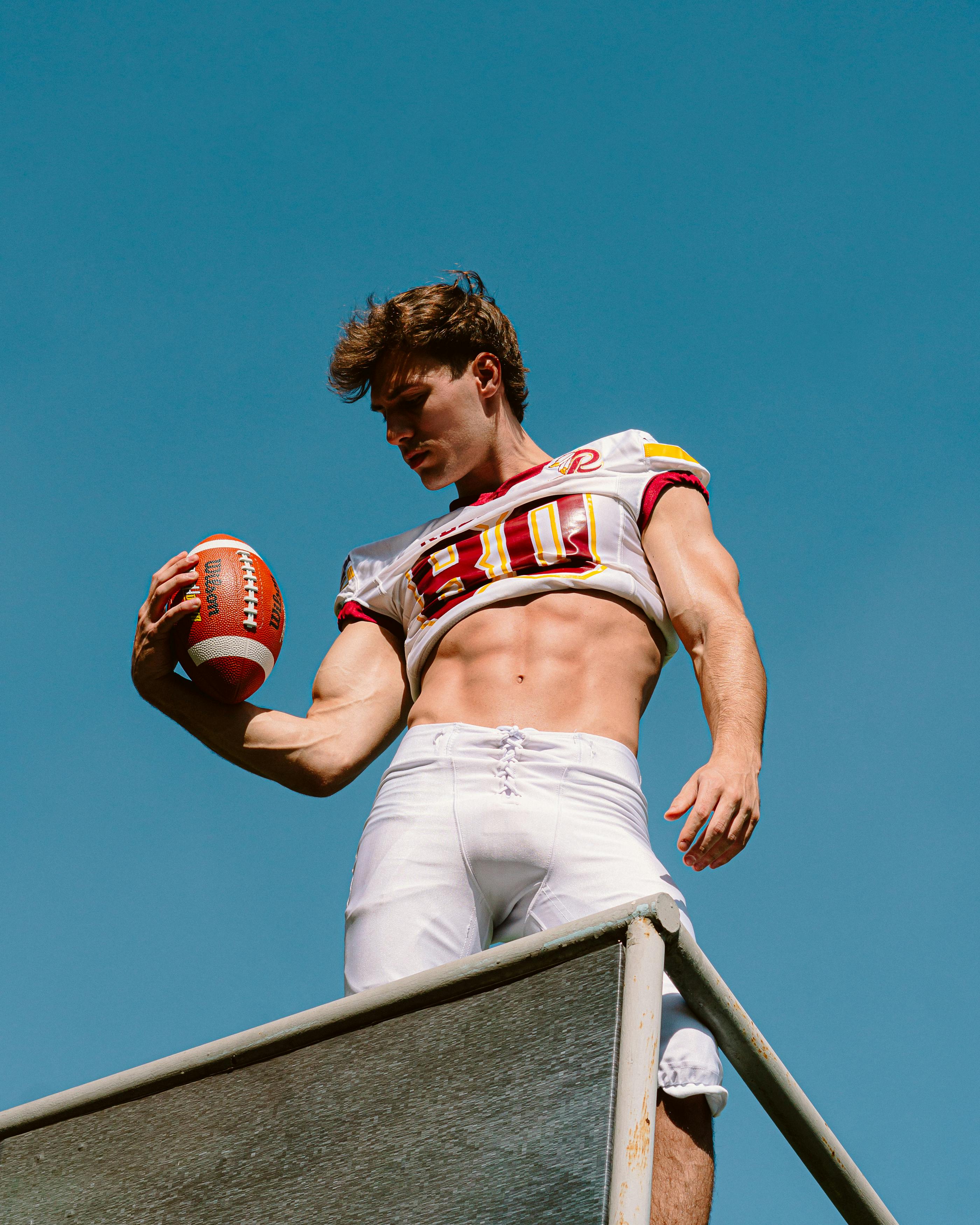 - "A young man wearing a white jersey with red and gold trim and white pants is standing on a metal railing" by FM-AUNdv2, licensed under CC BY 4.0