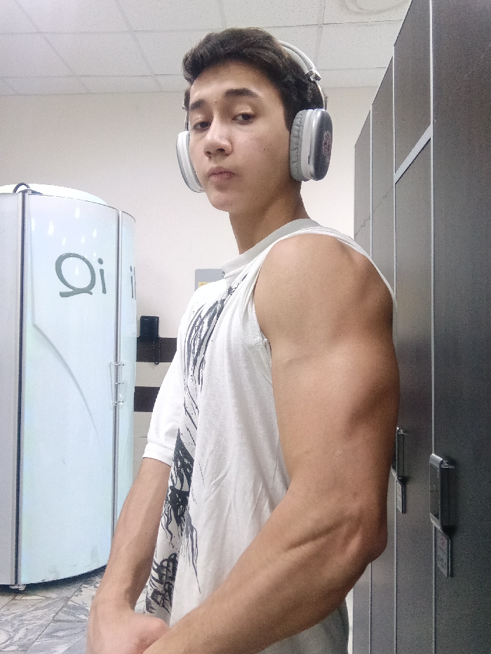 A young male individual, appearing to be in his late teens or early twenties, is depicted in what is identifiable as a changing room or facility within a fitness center