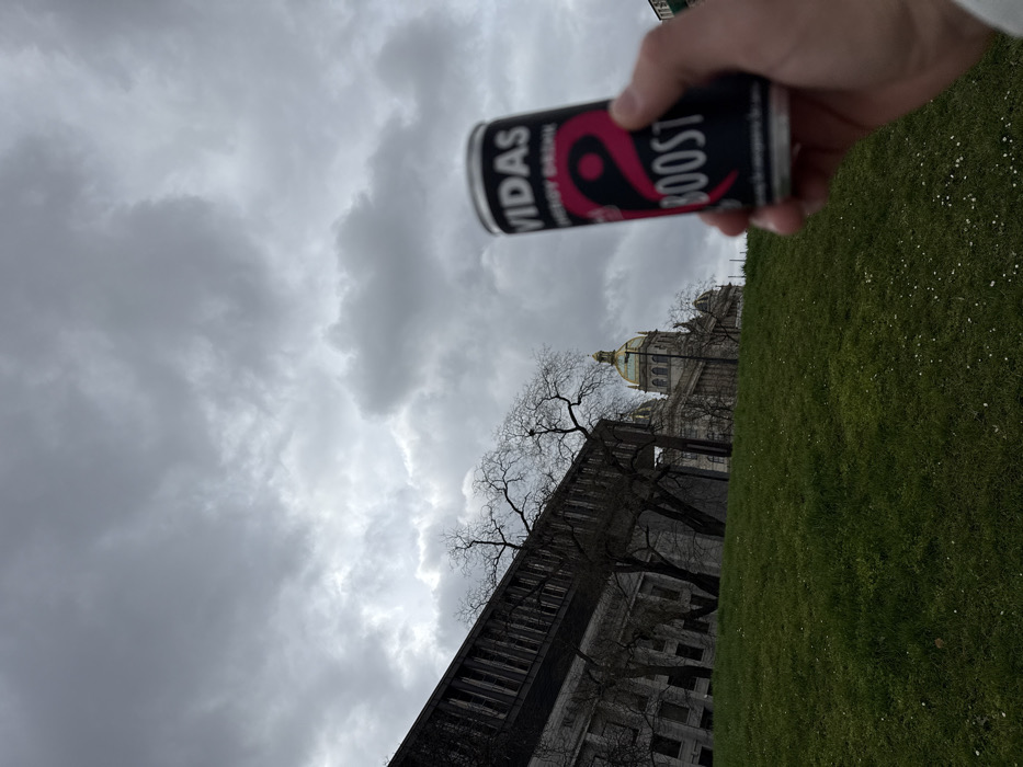A human hand, with light skin tone, holds a black "VIDAS BOOST" energy drink can in the lower right foreground