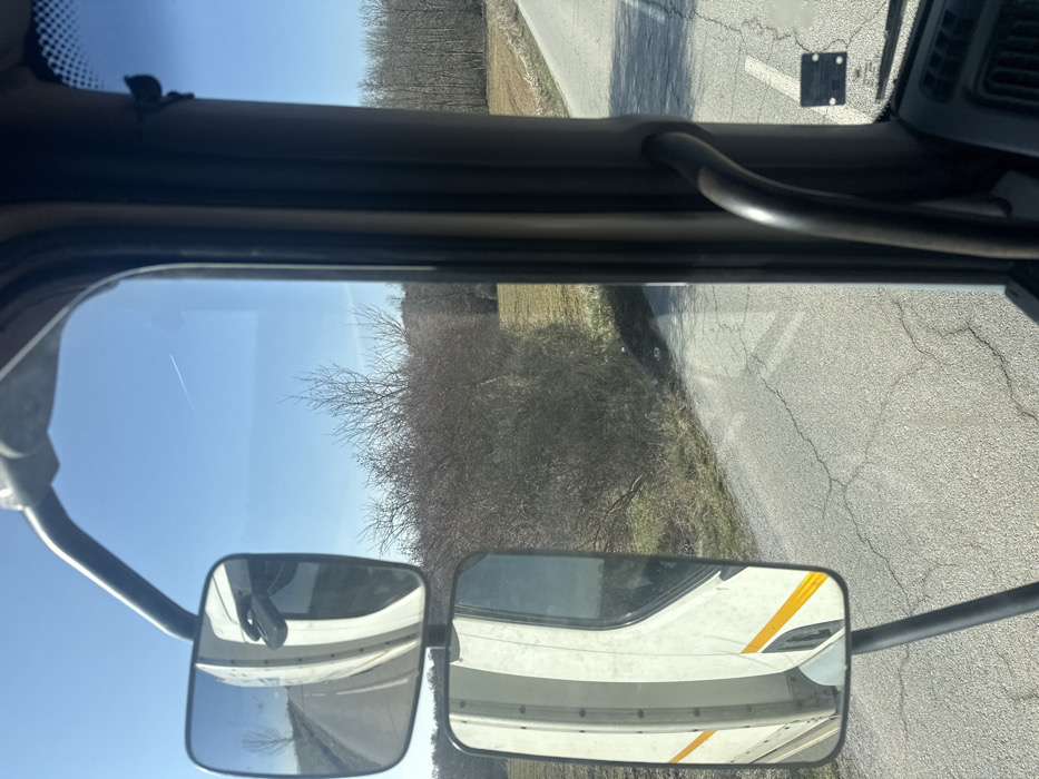 The image depicts a static view from the interior of a vehicle, looking out its right-side window onto a rural road and landscape in Begunovtsi, Bulgaria. The immediate foreground on the right features a dark, curved grab handle attached to a vehicle pillar. To the left, two rectangular side mirrors are positioned, reflecting the white exterior of the vehicle's cabin, which has a distinct horizontal yellow reflective stripe. The mirrors also reflect a segment of a paved road receding into the distance, with a solitary bare tree visible further back. Outside the vehicle, a grey asphalt road, displaying numerous surface cracks, runs generally parallel to the vehicle's orientation. Adjacent to the road is a narrow strip of dry ground and sparse vegetation. Beyond this, a dense line of bare deciduous bushes and trees forms a natural boundary, separating the road from an expansive, light-brown field of dry grass or stubble. In the far background, a dense forest of leafless trees covers a gently rising terrain. The sky is clear and bright blue, traversed by a single, thin white contrail from an aircraft. The scene is illuminated by direct sunlight, and no people or active subjects are visible.