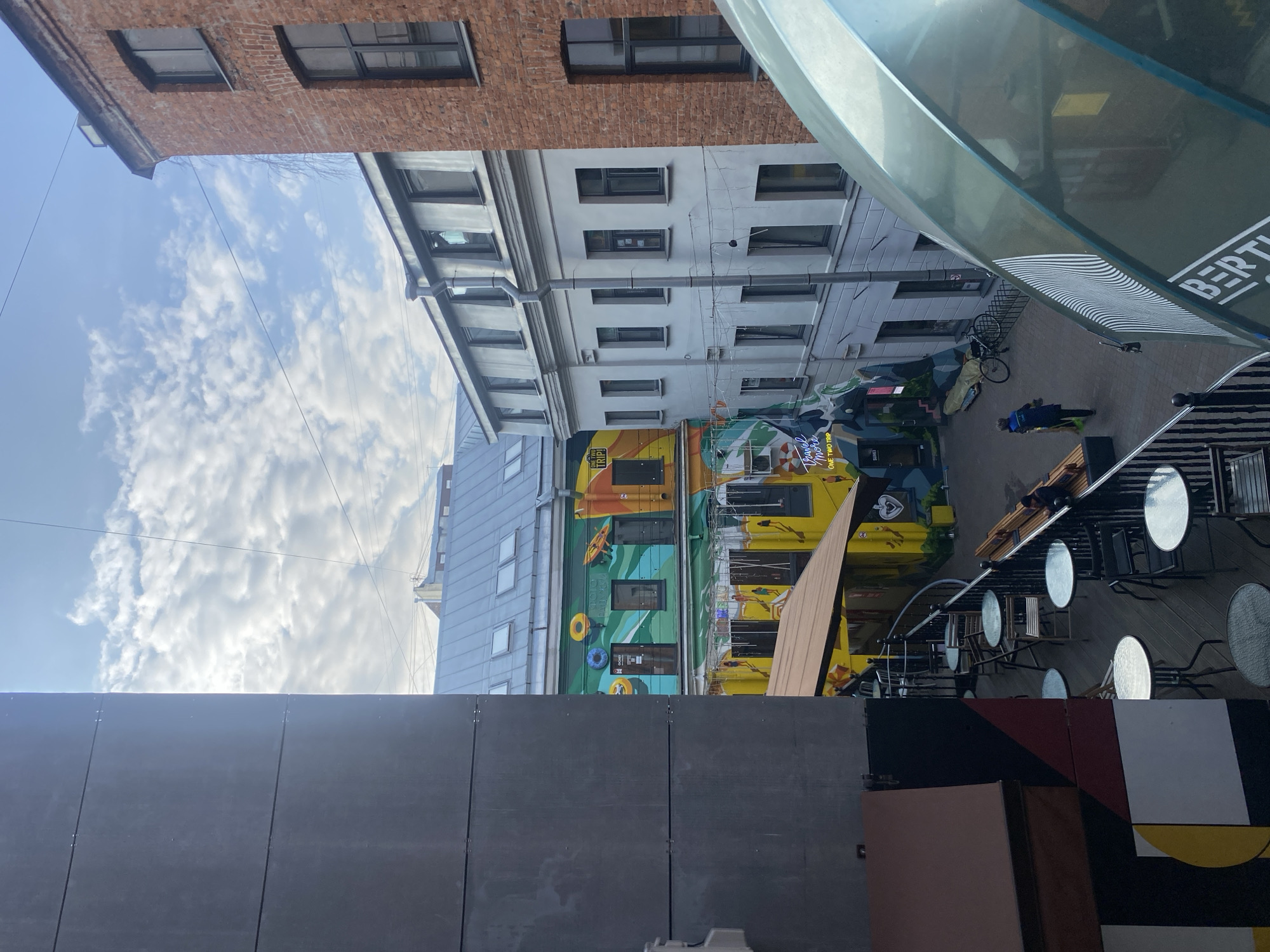The image depicts an alley in Saint Petersburg, Russia. The view is looking up from a low vantage point. Tall buildings flank the alley, constructed from brick and painted stone. One building is decorated with colorful murals featuring beach themes. The sky is visible between the buildings, partially covered with clouds. A few people are walking in the alley. Tables and chairs suggest an outdoor cafe. A partially visible structure overhead appears to be signage or part of an awning. The lower portion of the image is dominated by a gray wall.