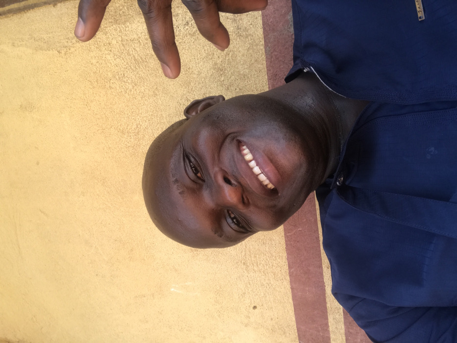 An adult dark-skinned male is captured in a close-up, slightly low-angle photograph, smiling broadly with white teeth exposed, and looking directly at the camera
