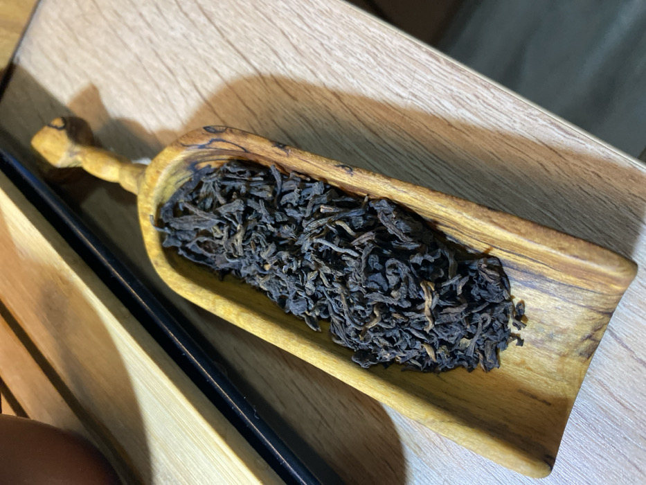 - "A close-up, high-angle shot depicts a wooden scoop filled with dried, dark brown to black tea leaves, resting on a light-colored wooden surface" by FM-EVa102, licensed under CC BY 4.0